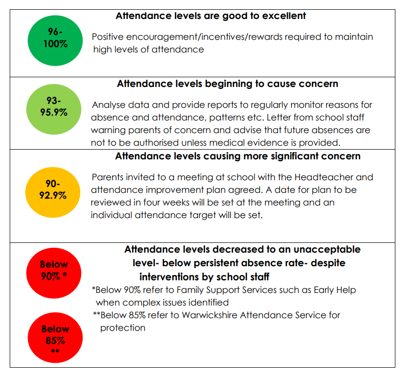 Our attendance target is 96% for the year for all children. If attendance falls below 96%, we will work with families to improve attendance through letters, meetings and family support. If children's attendance does not improve, we will make a referral to the Warwickshire Attendance Team who may take further action.