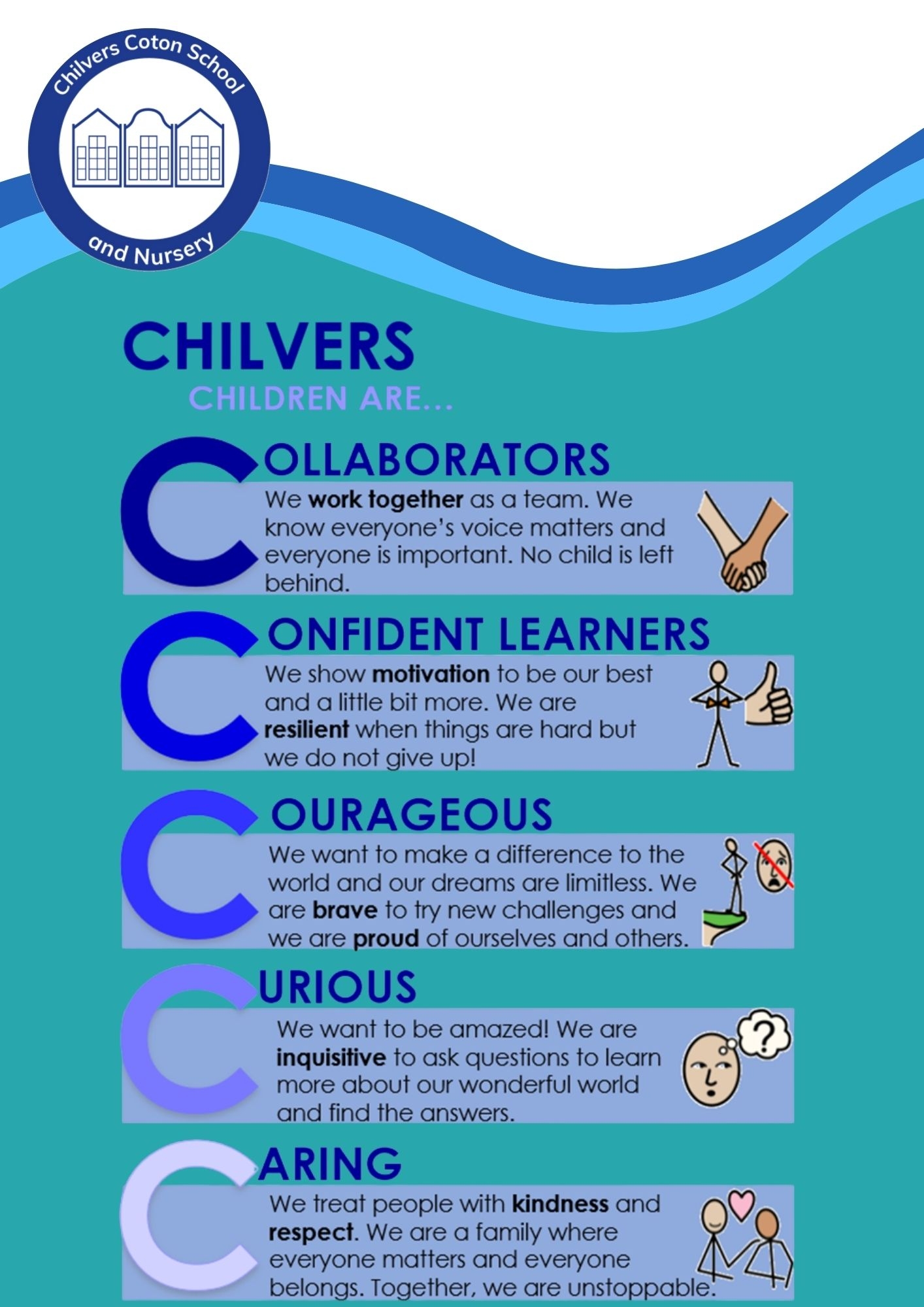 We believe every child is a Chilvers' Champion. We have 5 C's which underpin our school values.