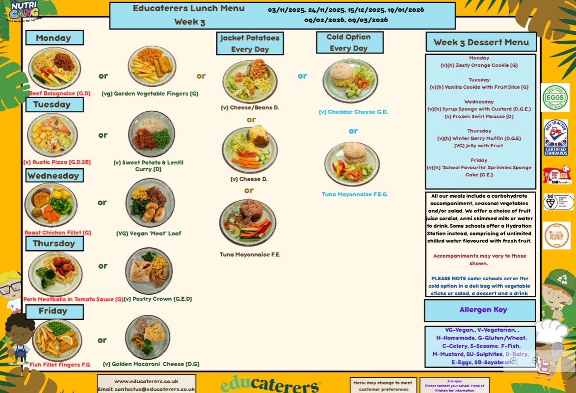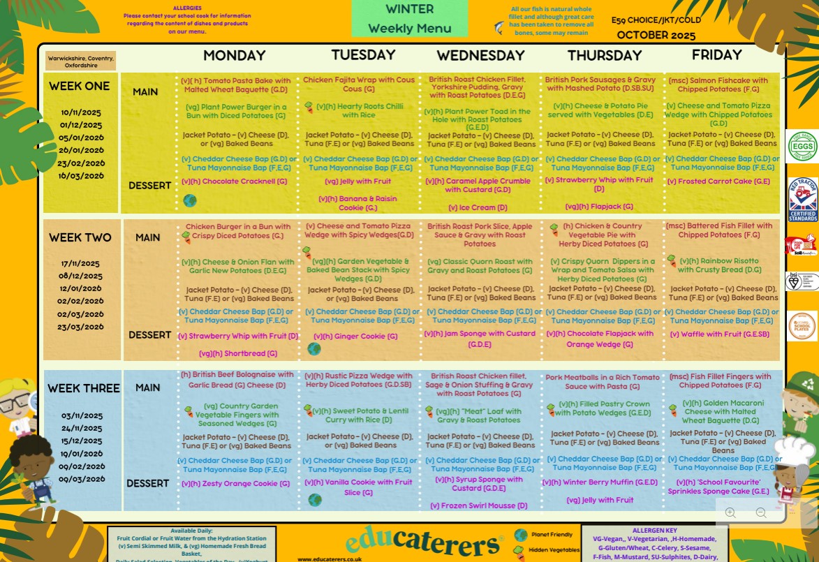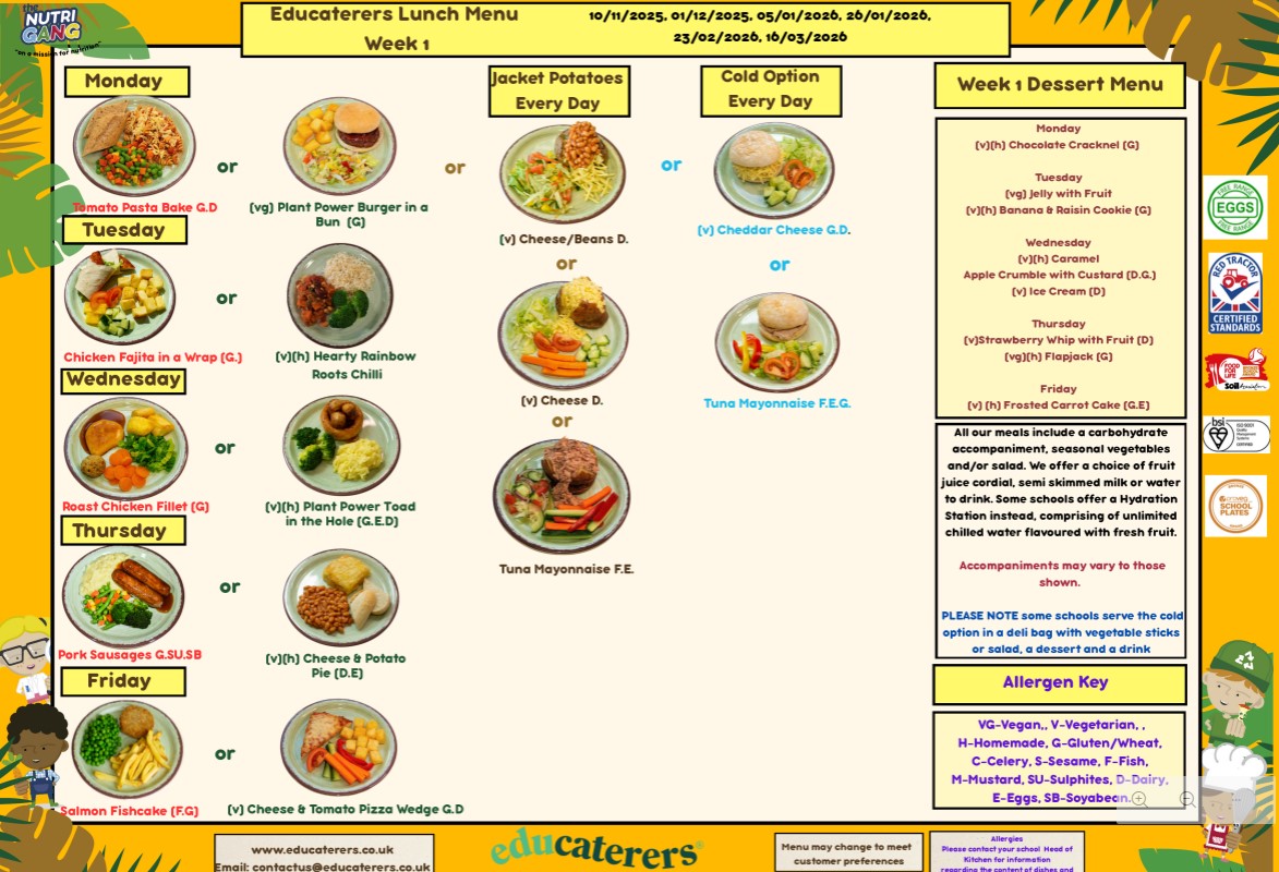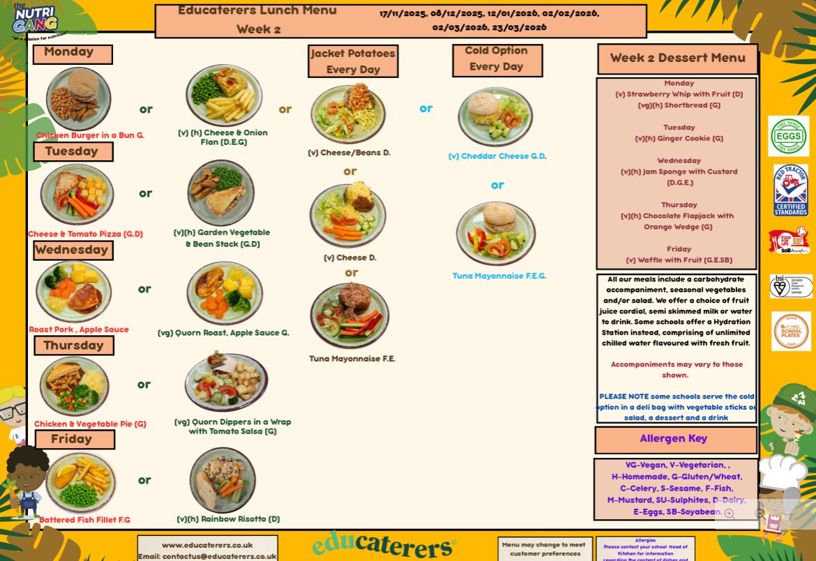 Children from Reception to Year 2 are eligible for a free school lunch everyday; saving families a lot of money and time! Our meals are all cooked on site and are nutritionally balanced. There are four choices every day; a hot meat choice, a hot vegetarian choice, jacket potatoes with a choice of fillings and a sandwich with a choice of filling (known as a deli bag).
